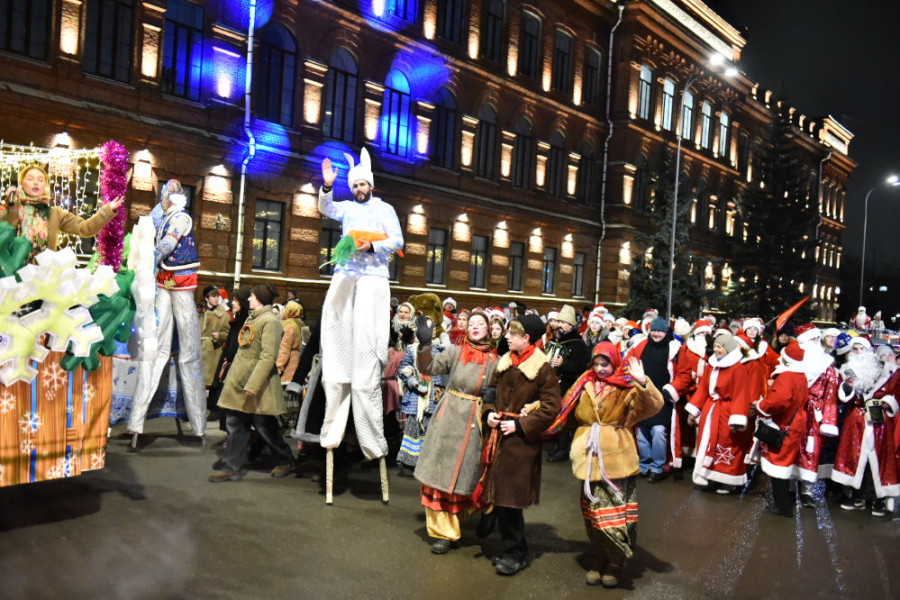 Участники мероприятия начали движение по улице Крестовой, шествием руководил Дед Мороз из Великого Устюга. Далее на площади Дерунова состоялось большое новогоднее представление, на котором зажгли новогодние огни на главной елке города.