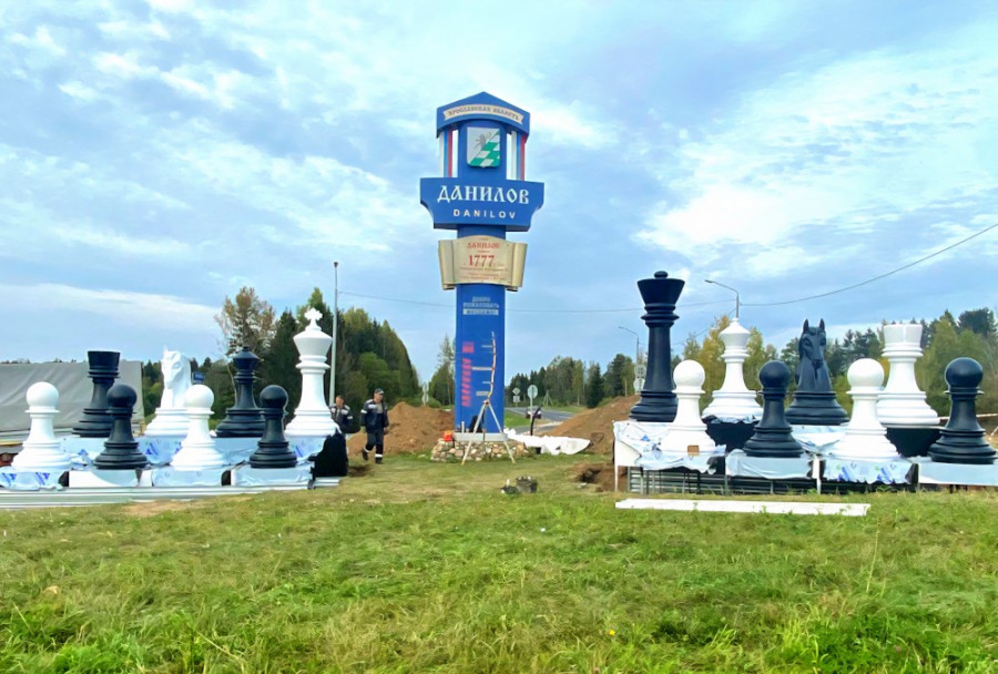 На федеральной трассе М8 начался монтаж стелы, которая встретит гостей при въезде в город Данилов. Конструкция, установка которой должна завершиться до конца сентября, воплощает фирменный стиль муниципалитета, позиционирующего себя как «шахматная столица Ярославской области».