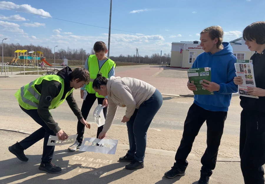 Затем главные помощники Госавтоинспекции просветительскую работу продолжили на улично-дорожной сети, где с помощью трафарета перед пешеходными переходами на асфальте нанесли белой краской надписи «Возьми меня за руку».